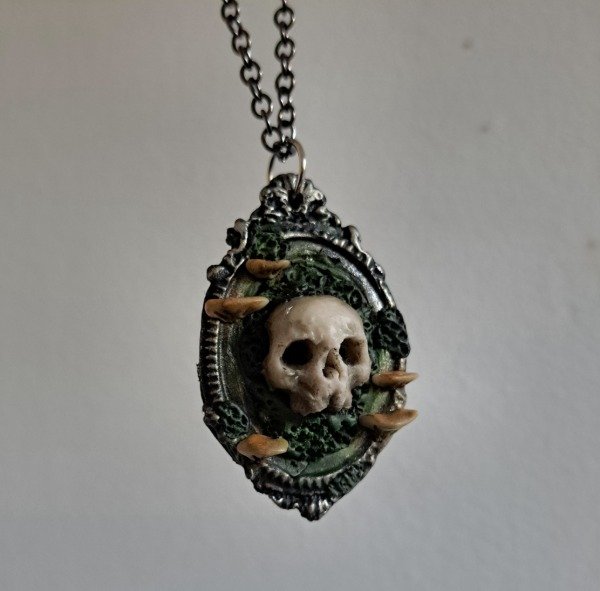 Collar modelado y pintado a mano en arcilla polimerica, con cuentas de vidrio, cadena de metal