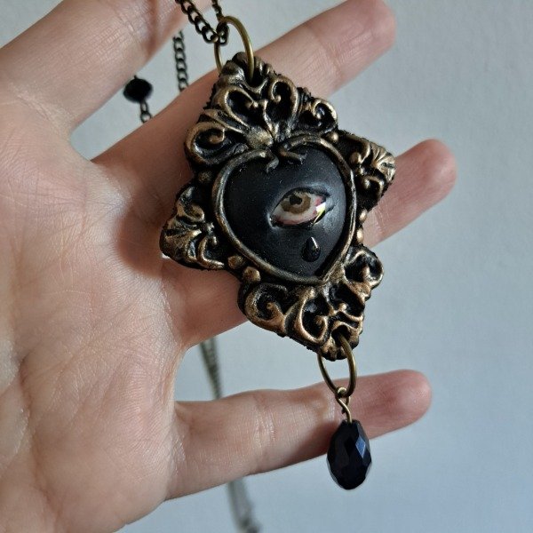 Collar modelado y pintado a mano en arcilla polimerica, con cuentas de vidrio, cadena de metal