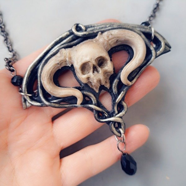 Collar modelado y pintado a mano en arcilla polimerica,, cadena de metal y cuentas de vidrio